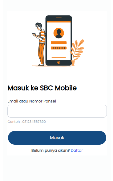 Fitur Login pada aplikasi SBC berfungsi untuk memberikan akses kepada pengguna yang telah terdaftar agar dapat menggunakan seluruh fitur dalam aplikasi. Pengguna cukup memasukkan email atau nomor handphone yang telah terdaftar, tanpa password dan akan menerima kode verifikasi untuk masuk ke aplikasi.