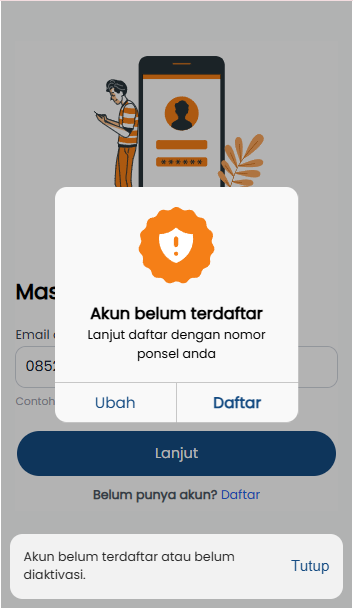 - Jika pengguna mencoba login dengan nomor handphone atau email yang belum terdaftar, maka: