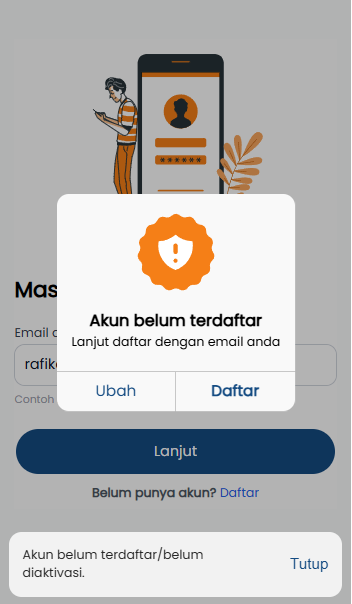 - Muncul pop-up konfirmasi dengan pesan “Akun belum terdaftar. Lanjut daftar dengan email/nomor handphone Anda?”.